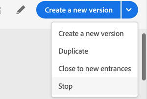 The Stop and Close to new entrances options allow you to terminate live journeys. Closing a journey involves that the arrival of new customers in the journey is blocked and that the customers who already entered in the journey are able to experience it to the end. This is the most recommended way to put an end to a journey as it offers the best experience for customers. Stopping a journey involves that people who already entered a journey are all stopped in their progress. The journey is basically switched off.