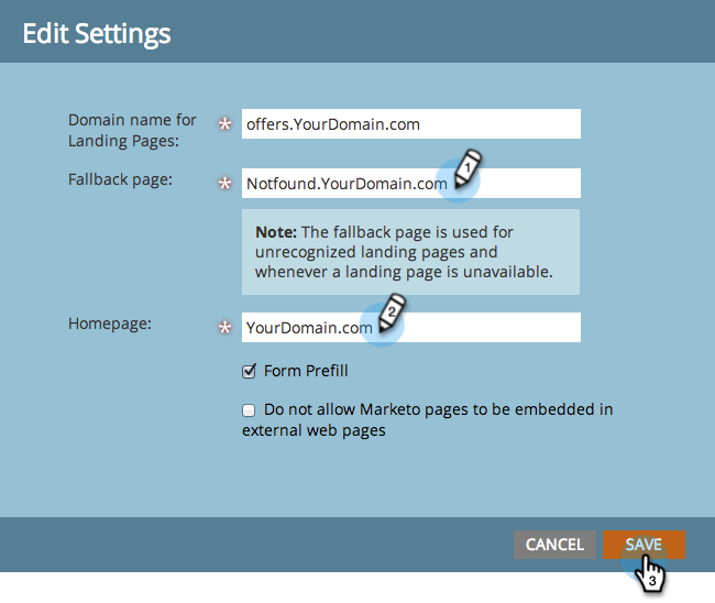 Configure your domain settings so landing pages use your company’s domain instead of Marketo’s (where they are hosted).
