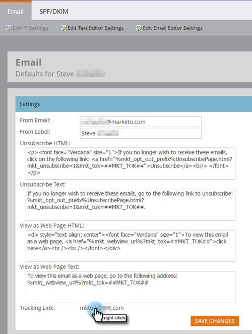 2) For our tracking links in email, add a DNS Entry (CNAME) for [EmailTrackingCNAME].[CompanyDomain].com, pointing to [MktoTrackingLink].