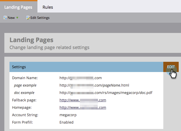 Select Landing Pages and click Edit in the Settings area.