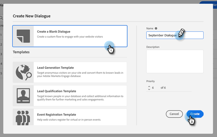 Choose a blank Dialogue, or one of the pre-populated templates. Enter a name (description is optional), change the priority level (optional), and click Create.