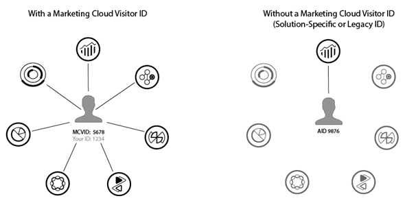 Le service d’identité active le framework d’identification courant pour les services principaux, les solutions, les attributs du client et les audiences d’Experience Cloud dans le service principal aux personnes Pour ce faire, le service attribue un identifiant persistant et unique à un visiteur du site. Lorsque votre organisation met en œuvre le service d’ID, cet identifiant permet d’identifier un même visiteur et ses données dans différentes solutions Experience Cloud.