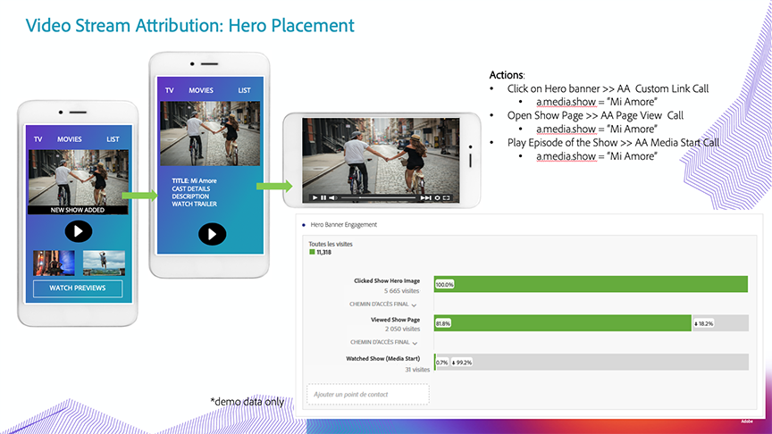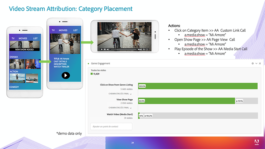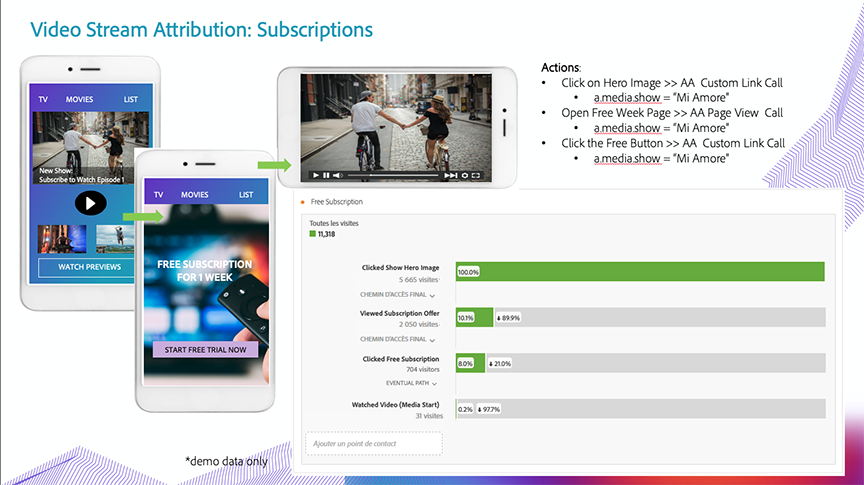 Grâce à l’attribution des diffusions multimédia, les clients peuvent désormais ajouter n’importe quelle dimension multimédia à tous les autres appels d’analyse, tels que les pages vues et les liens personnalisés. Pendant l’implémentation, vous devez ajouter les paramètres de données contextuelles du média aux appels de suivi Analytics. La liste complète des paramètres de données contextuelles utilisés pour les médias est disponible ici : Paramètres audio et vidéo.