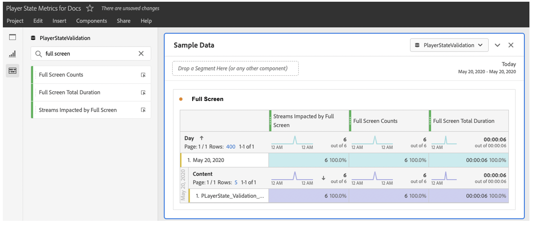 Dans Analytics Workspace, toutes les nouvelles propriétés se trouvent dans le panneau des mesures. Par exemple, vous pouvez rechercher par full screen pour consulter les données portant sur le passage en plein écran dans le panneau des mesures.
