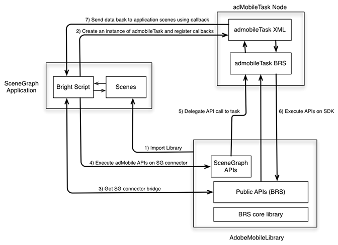 Pour ajouter la prise en charge de SceneGraph au kit SDK AdobeMobile, Adobe a ajouté une nouvelle API qui crée un pont de connecteur entre le kit SDK AdobeMobile et adbmobileTask. Le second est un nœud SceneGraph utilisé pour l’exécution de l’API du kit SDK. (L’utilisation d’adbmobileTask est expliquée en détail dans tout le reste de ce document.)