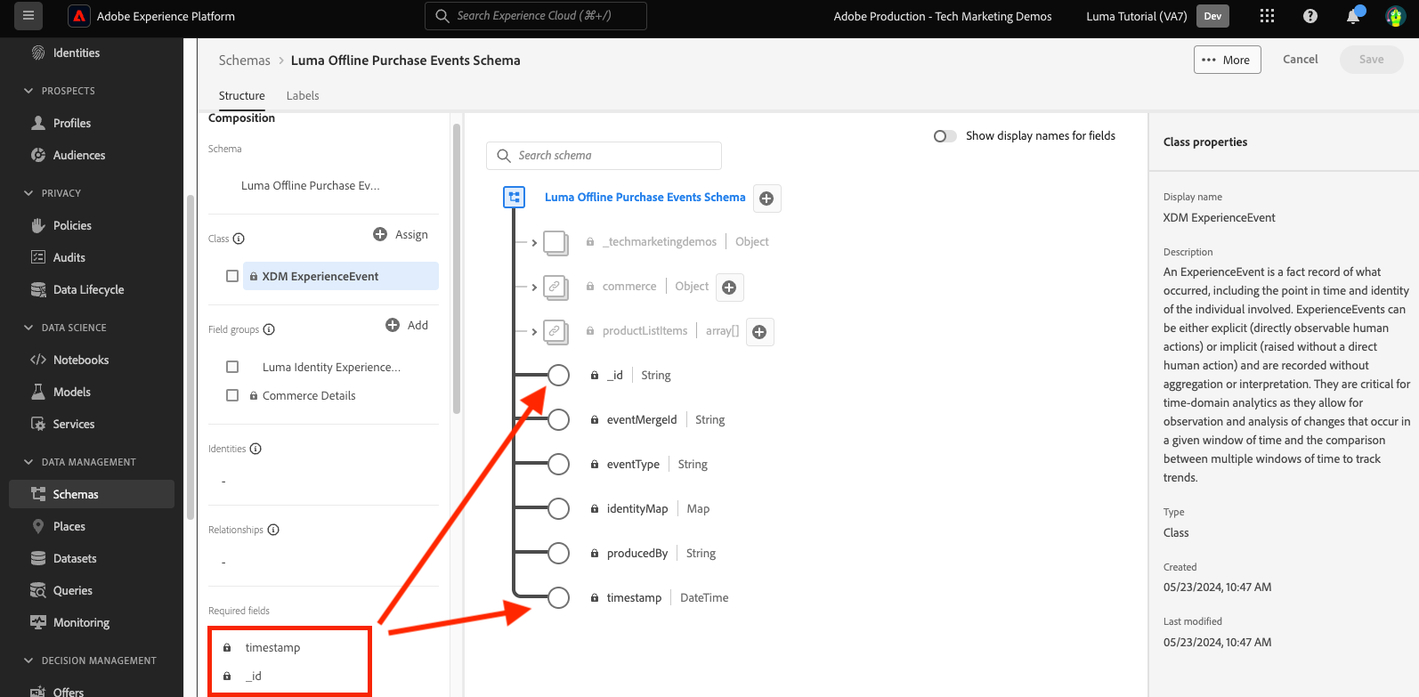 Also, select XDM ExperienceEvent under the Class heading and inspect some of the fields contributed by this class. Note that _id and timestamp fields are required when using the XDM ExperienceEvent class—these fields must be populated for every record you ingest when using this schema: