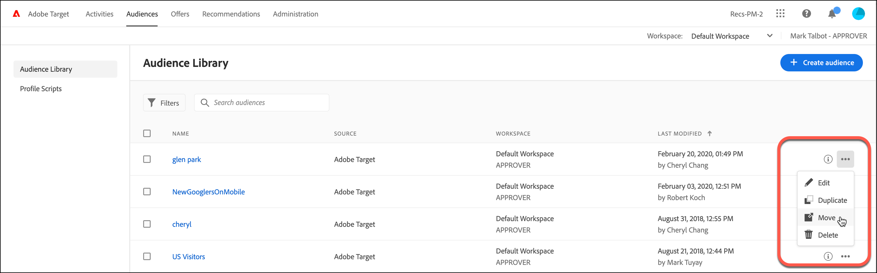 Audience list: You can move audiences between workspaces by using the More Actions > Move option on the Audiences page.