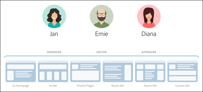 Le nouveau modèle Target d’autorisations de se compose des mêmes trois rôles (observateur, éditeur et approbateur). Vous pouvez toutefois affecter à un même utilisateur des autorisations distinctes pour chaque page, propriété ou site, comme illustré ci-après :