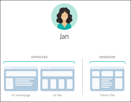 Dans cet exemple, Jeanne a les autorisations associées à son rôle d’approbatrice pour la page d’accueil et le site américains et les autorisations associées à son rôle d’observatrice pour le site français.