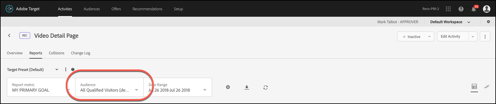 보고에서 세그멘테이션을 보려면 Audience 활동의 보고서에 있는 드롭다운 목록입니다.
