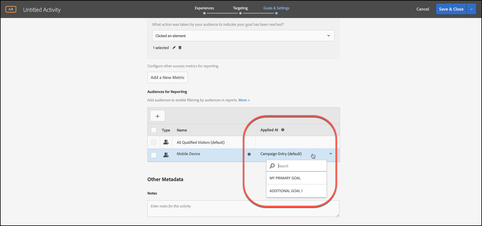 사용자를 보고 대상이 될 수 있도록 하는 성공 지표를 선택하십시오 Adobe Target.