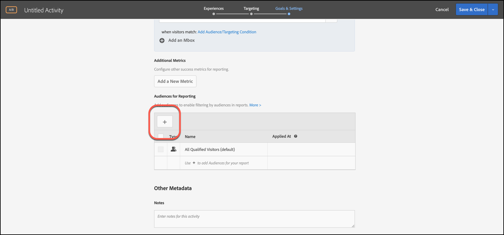 지표 타깃팅에서 사용할 결합된 임시 대상을 활동의 목표 및 설정 페이지에서 만들어 수 있습니다. 예를 들어, 결합된 대상을 사용하여 전환을 기반으로 타깃팅을 만들려면 다음을 수행하십시오.