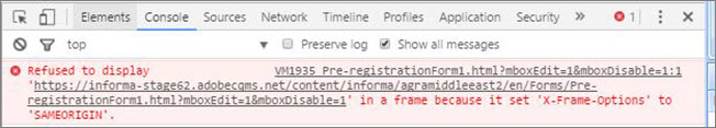 Lors de l’utilisation du mode Parcourir, si vous accédez à une URL qui ne comporte pas target.js ou contient un en-tête avec des iframes, le compositeur d’expérience visuelle apparaît rompu. En raison de problèmes de sécurité du navigateur, Target ne peut pas accéder à l’URL à laquelle vous avez accédé.