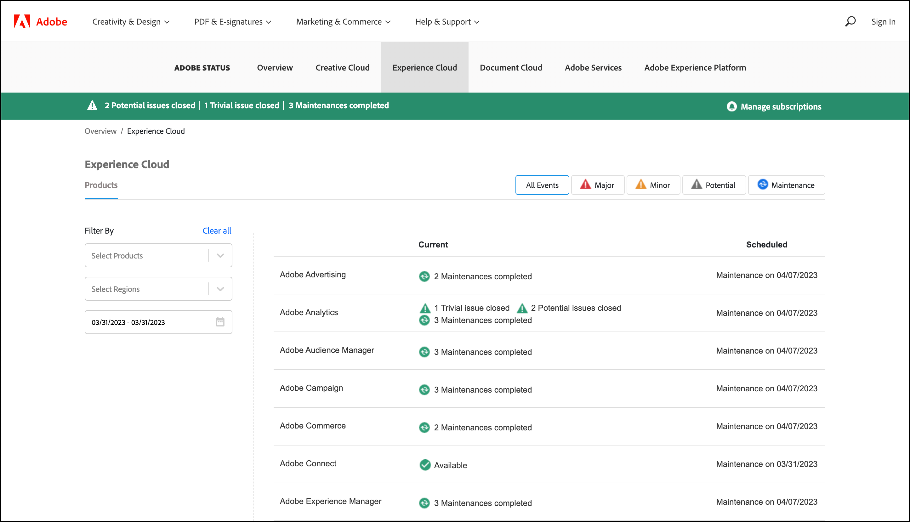 Dans l’illustration ci-dessus, Adobe Analytics, Adobe Target et Adobe Campaign étaient en train d’exécuter des mises à jour de maintenance. Tous les autres produits et solutions fonctionnaient normalement. Consultez cette page si vous rencontrez des problèmes lors de l’utilisation de Target.