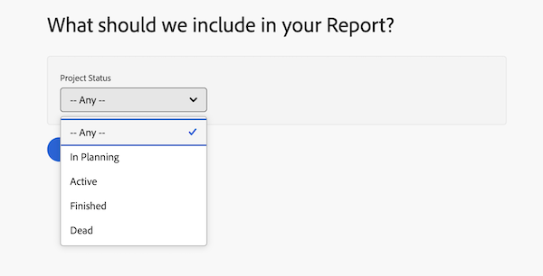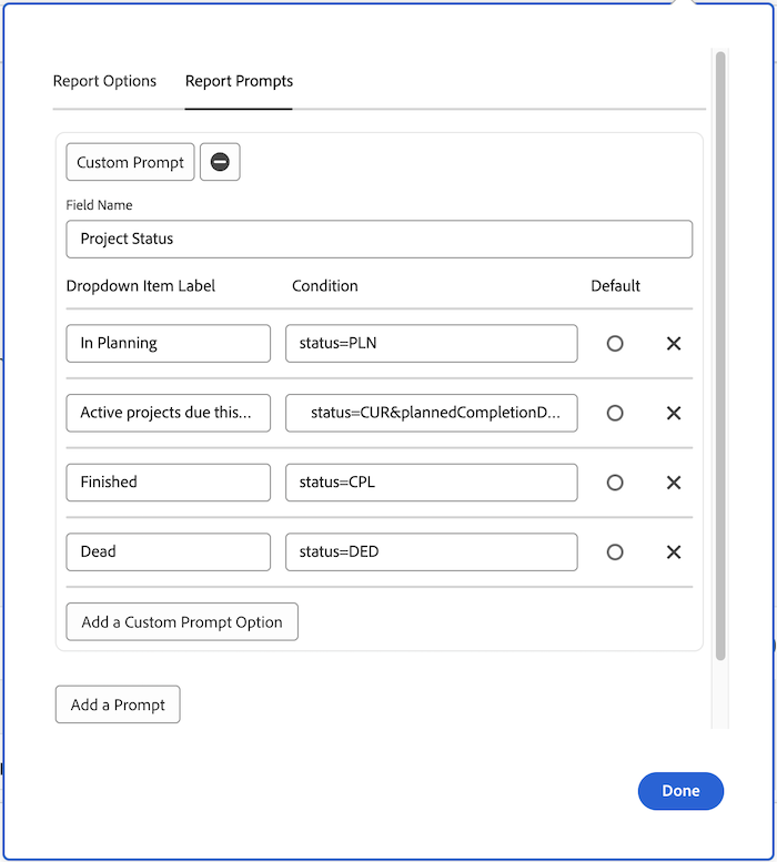 Create a custom prompt that shows the following project statuses in the prompt drop-down menu: