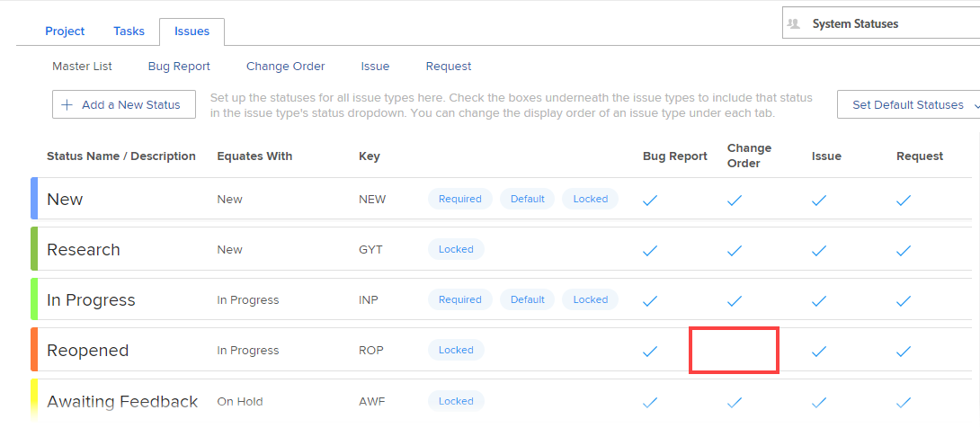 If the custom status is an Issue status, all four issue types must be enabled for it (Bug Report, Change Order, Issue, and Request). For example, in the issue status shown below, the status Reopened cannot be used as a default status because the Change Order issue type is not selected: