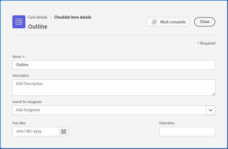 (Optional) Add a description, assignees, due date, and estimation hours for the checklist item.