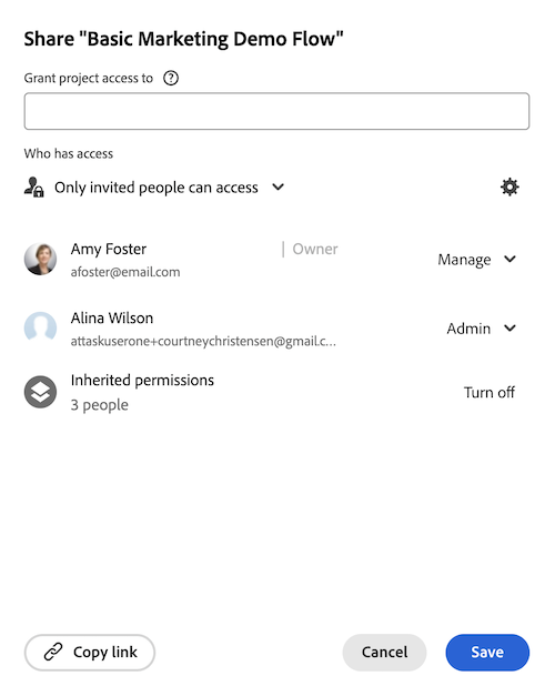 Along with the access level that users are granted, you can also grant them permissions to specific objects that you have access to share. For more information about access levels and permissions, see How access levels and permissions work together.