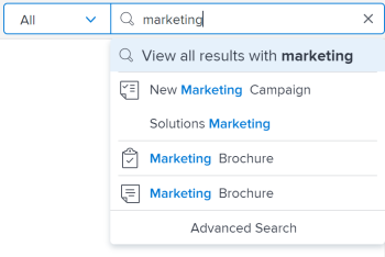 For example, searching for “marketing” displays objects that contain either “marketing” or “market” in the name. -