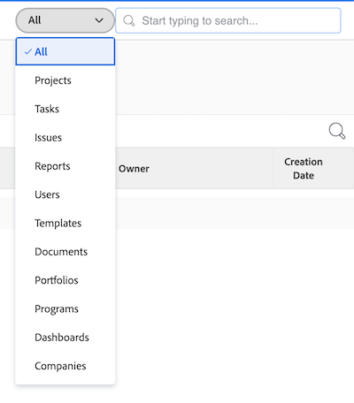 (Optional) To search for a specific object, click the All drop-down menu and select the object you want to search for.