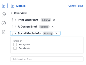 You can add a custom form to a document or to a document version to capture additional information or metadata specific to your assets.