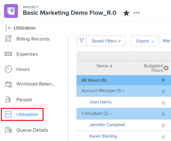 You can view the Utilization report in the Resourcing area to display utilization across multiple projects, or you can view it at the level of one project, to display utilization for the individual resources (job roles and users) associated with that project.
