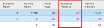 The total budgeted hours minus the total actual hours on the included projects. You can view the total budgeted variance for the overall life of the included projects, or you can view the total budgeted variance only for the specified date range (you can specify an individual week or month).