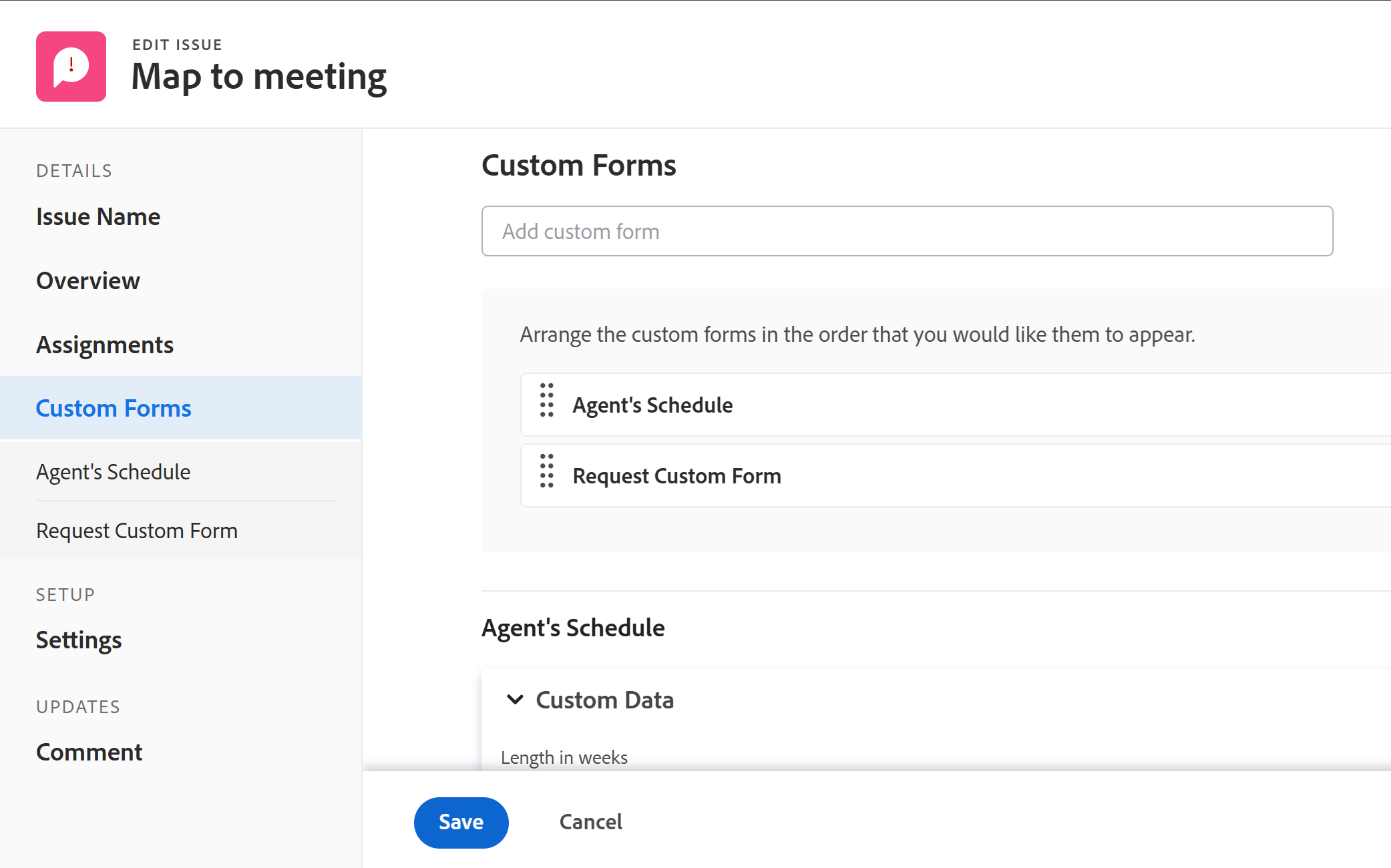 In the Add custom form field, select the custom form or forms that you want to associate with the issue. You must build the custom forms before they are available to select in this field. Only active custom forms display in the list. For more information about building custom forms, see Create a custom form. You can add up to ten custom forms to an issue.