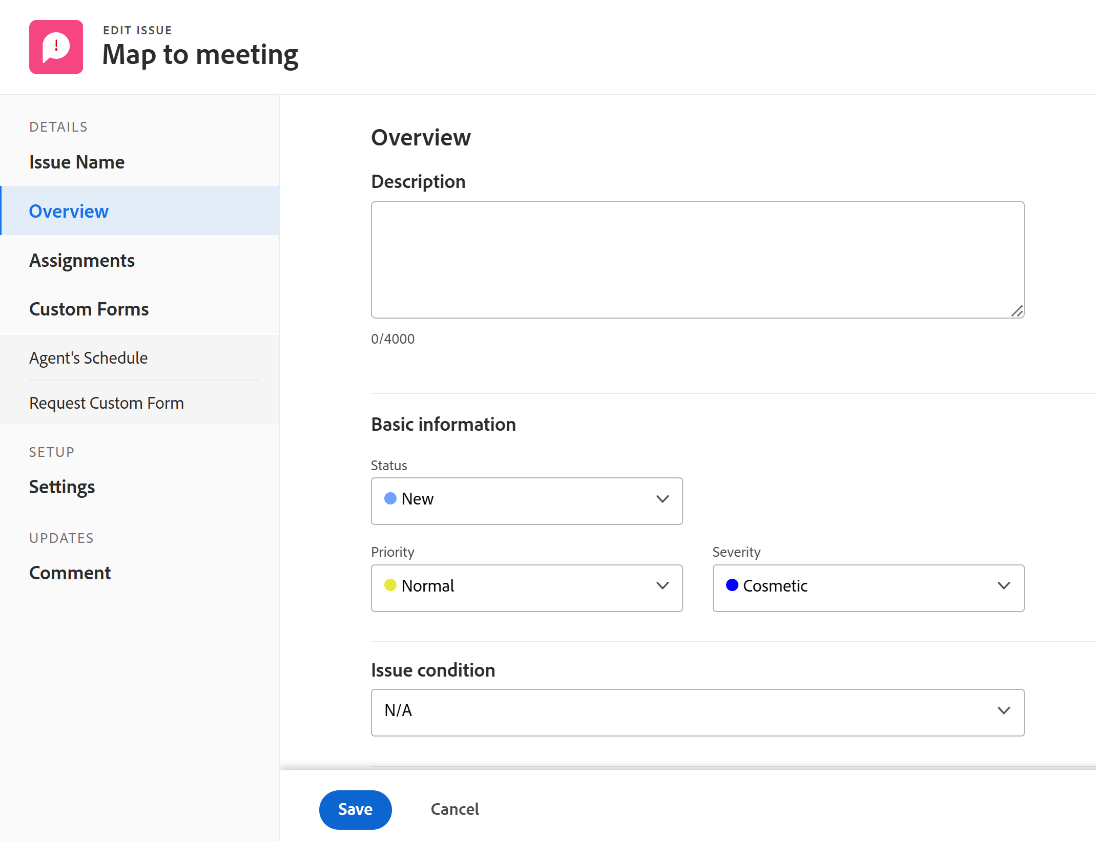 table 0-row-2 1-row-2 2-row-2 3-row-2 4-row-2 5-row-2 6-row-2 7-row-2 8-row-2 9-row-2 10-row-2 11-row-2 12-row-2 13-row-2 14-row-2 15-row-2 layout-auto html-authored no-header Description Add additional information about the issue. Status Select the status of the issue. For more information about issue statuses, see Access the list of system issue statuses. Priority This is a visual flag for you which allows you to prioritize issues.