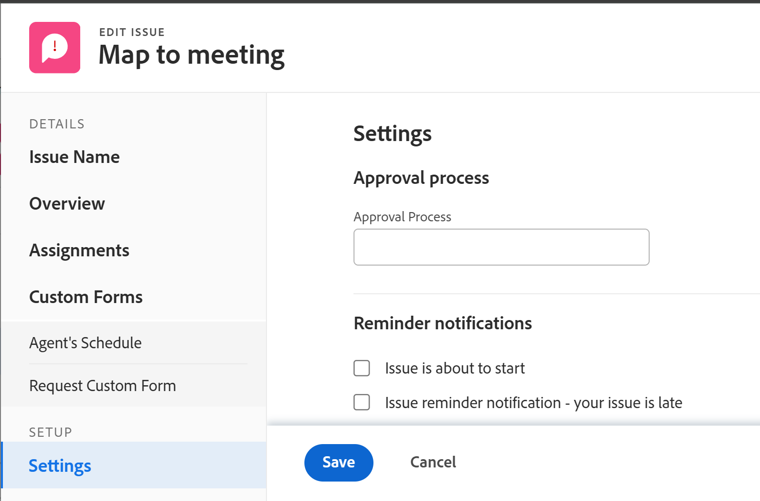 Reminder Notifications Select the checkbox for which Reminder Notifications you would like to attach to this issue. All reminder notifications for issues display. Your Workfront administrator must configure Reminder Notifications before you can select them on an issue. For more information about configuring Reminder Notifications, see Set up reminder notifications -
