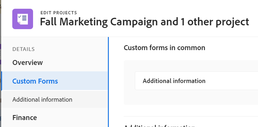 The custom forms that are attached to all the selected projects display in the Custom forms in common subsection in the Custom Forms area.