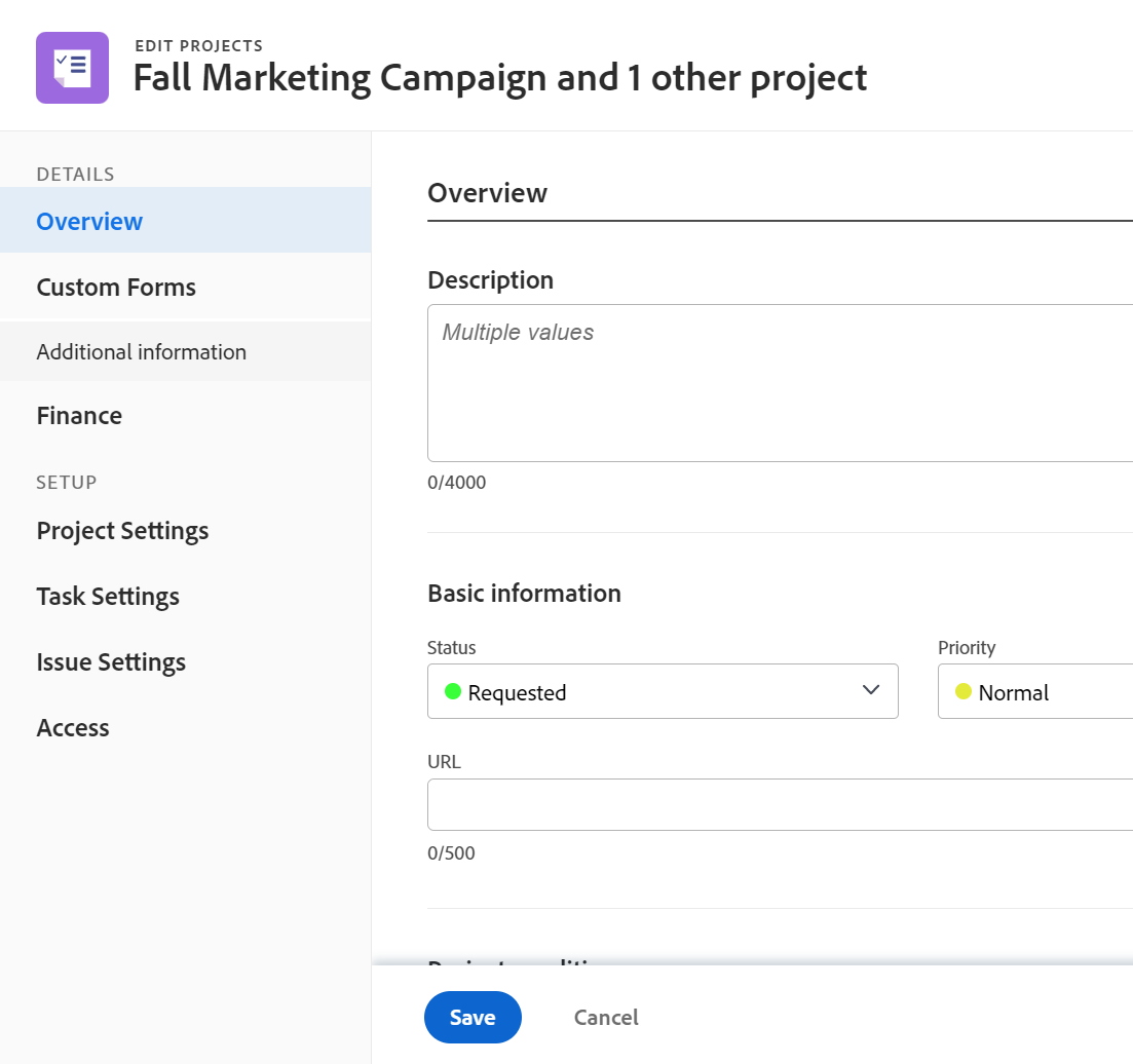 When you select projects that have different values for the same field, the field displays a “Multiple values” indicator in the Edit projects box. Fields that are checkboxes, radio buttons, and toggles have a “Multiple values” indicator next to them.