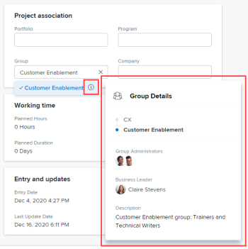 Portfolio Indicate a Portfolio that the project belongs to. You must create a Portfolio first, before it appears in the drop-down list. Only active portfolios can be associated with a project. For more information about creating portfolios, see Create a portfolio.