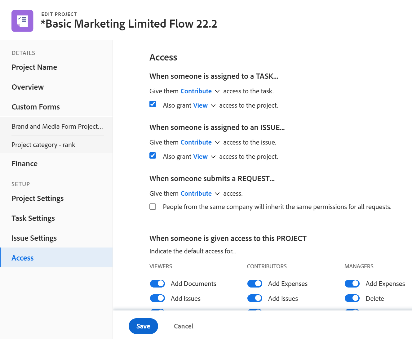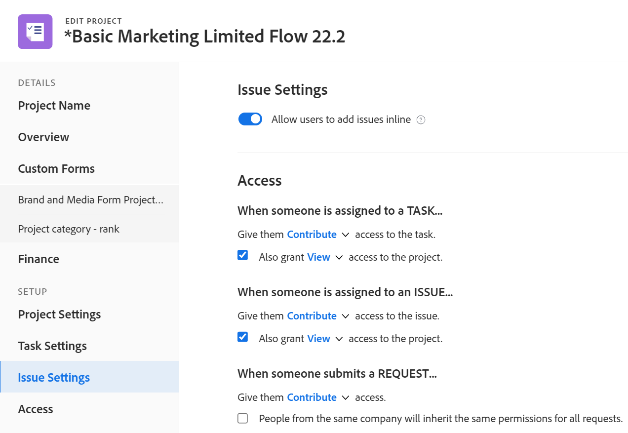 table 0-row-2 1-row-2 2-row-2 3-row-2 4-row-2 5-row-2 6-row-2 layout-auto html-authored no-header When someone is assigned to a task Select from View, Contribute, or Manage access to a task. The user assigned to a task is automatically granted this access to the task. Also grant access to the project Select from View, Contribute, or Manage access to the project. The user assigned to a task is automatically granted this access to the project, as well. When someone is assigned to an issue Select from View, Contribute, or Manage access to an issue. The user assigned to an issue is automatically granted this access to the issue. For more information, see Share an issue. Also grant access to the project Select from View, Contribute, or Manage access to the project. The user assigned to an issue is automatically granted this access to the project, as well. When someone submits a request: Give them access Select from View, Contribute, or Manage access to the request. When the project is also a request queue and a user submits a request to the project, they are granted this access to the request they submitted. For information about setting up a project as a request queue, see Create a Request Queue. People from the same company will inherit the same permissions for all requests. Select this field if you want people from the same company to have the same access to all the requests on the project, whether they submitted them or not. When someone is given access to this project: Indicate the default access for ... Select the access options that you want users to have on the project, if the project is shared with them. Select the specific options for their access if they are designated as Viewers, Contributors, or Managers when sharing the project with them.