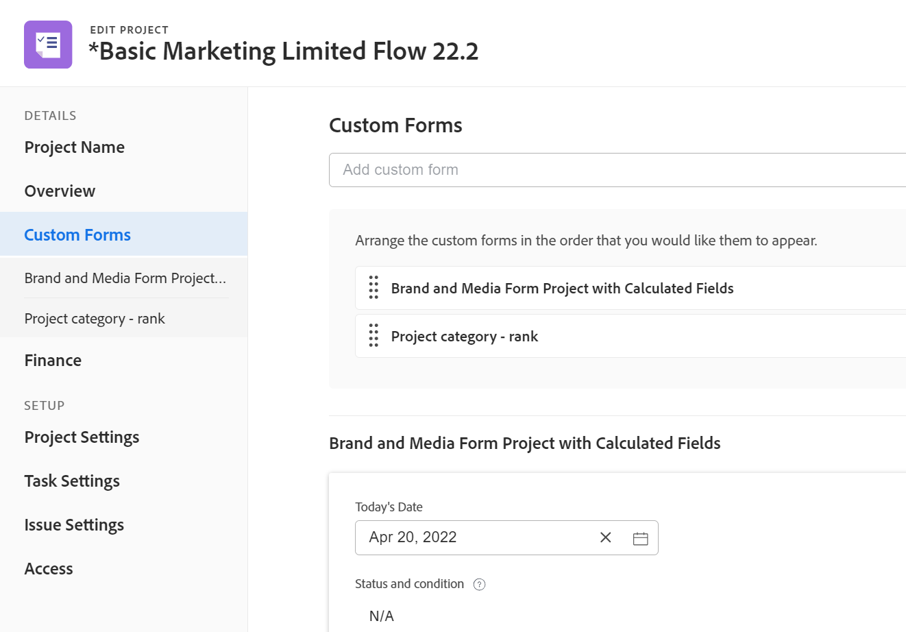 Click Custom Forms to edit, add, or replace custom forms associated with the selected projects.
