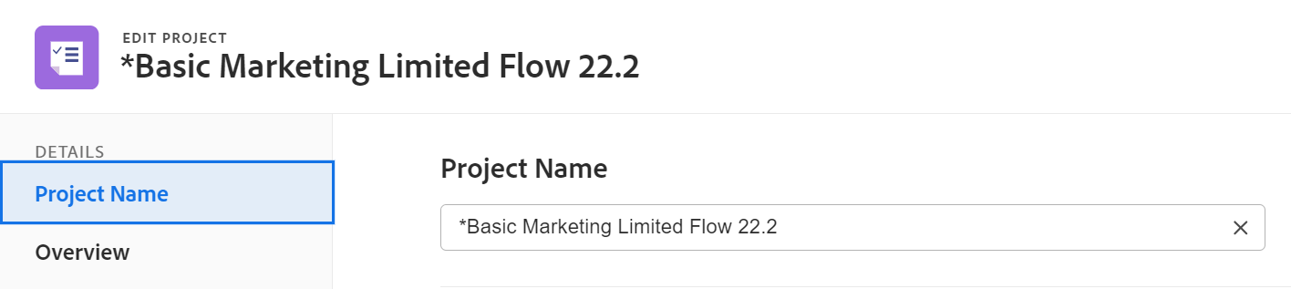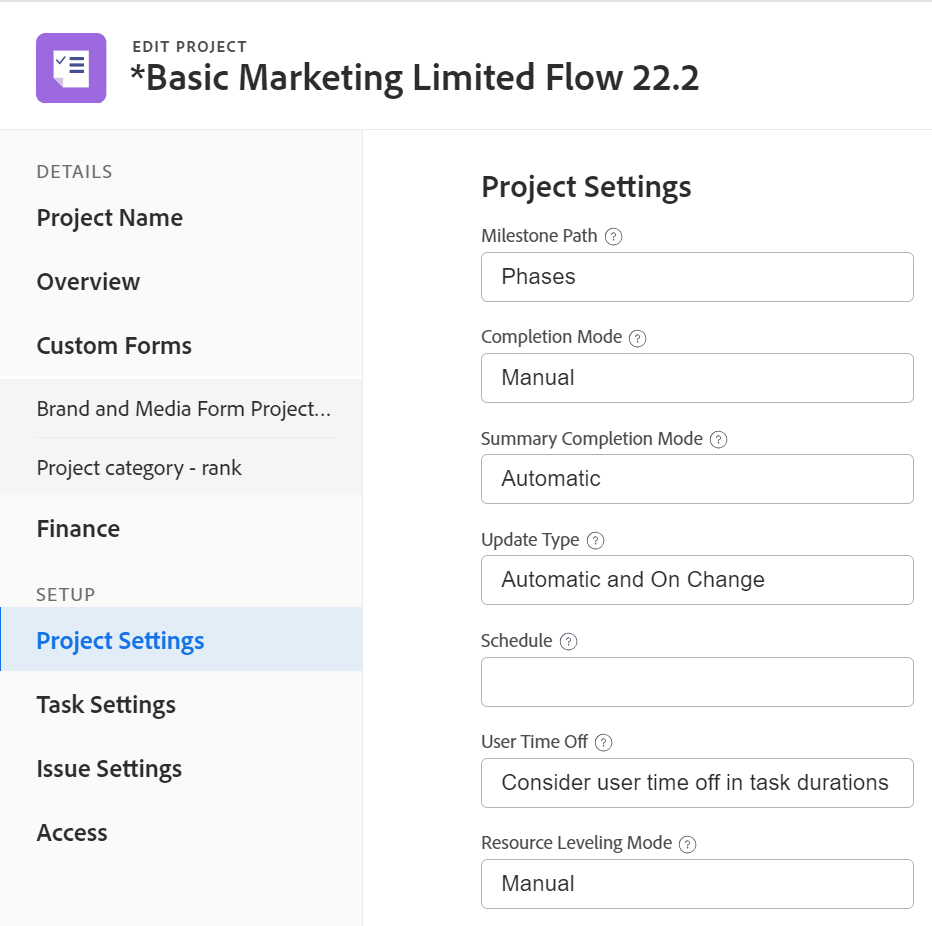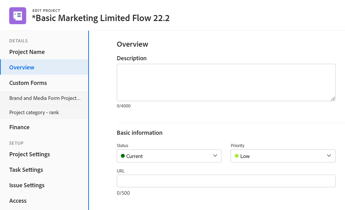 Depending on how your Workfront administrator or Group administrator modified your Layout Template, the areas in the left panel of the Edit Project box or any fields listed in these areas might be rearranged or not display. For information, see Customize the Details view using a layout template.