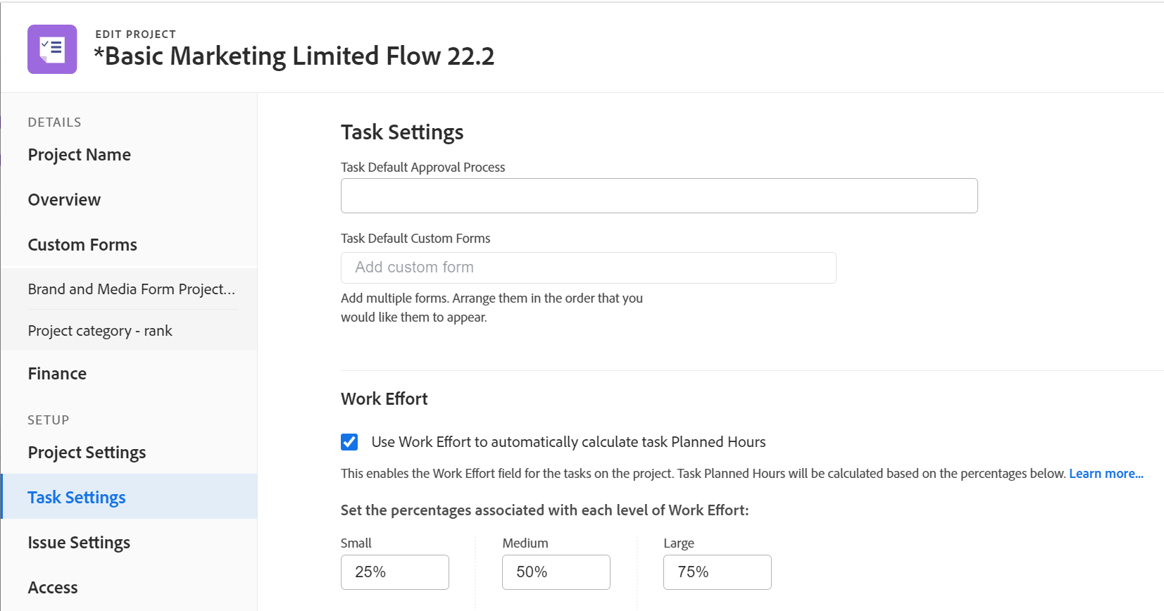 (Conditional and optional) If you selected Use Work Effort to automatically calculate task Planned Hours, click the drop-down menu for each level of effort and select a percentage for each level. The following percentage values are defaults: