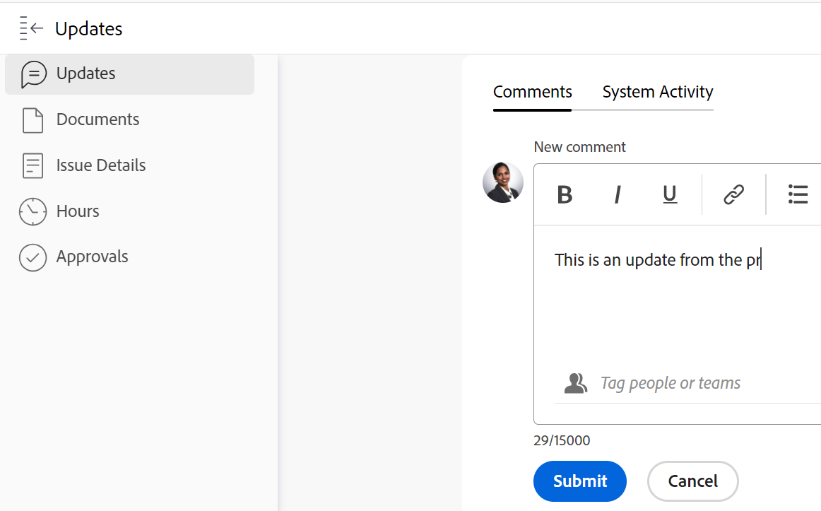 To notify certain users about the update, type their names in the Tag people or teams field that appears when you type a comment. For more information, see Tag others on updates.