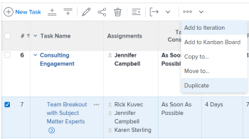 You can quickly duplicate a task in a task list, if you need an identical task on the same project.