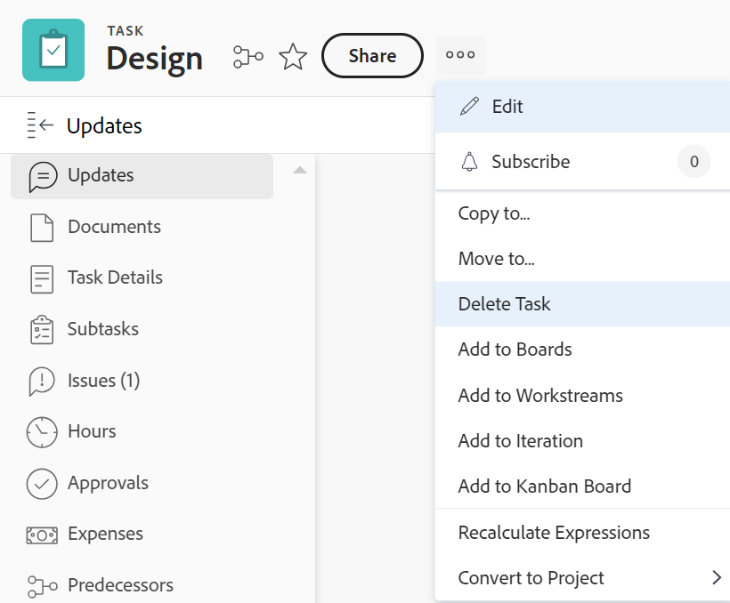 Depending on how your Workfront administrator configures the Project, Task, or Issue Deletion Preferences in the Timesheet & Hour Preferences of your Workfront instance, hours logged for the tasks are handled in one of the following ways when deleting a task: