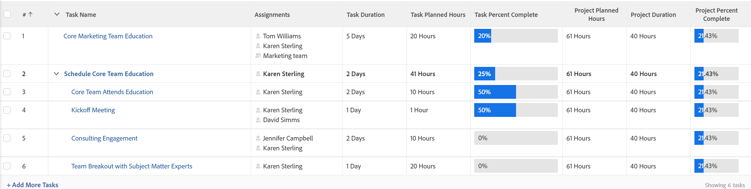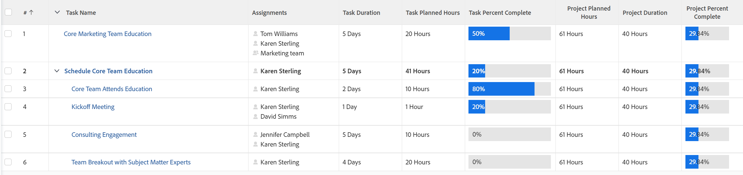 Similarly, the Percent Complete of a project is based on the durations or planned hours of each main task in the project.