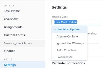 In the Settings section, use the Tracking Mode drop-down menu to select the Tracking Mode for the task.