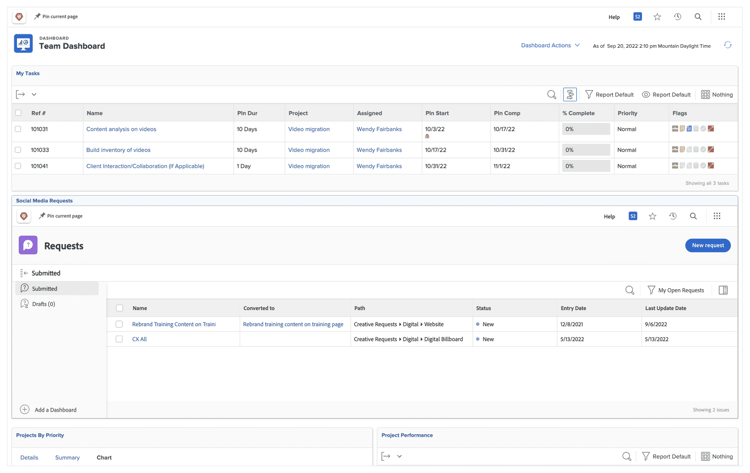 Many Workfront customers write custom reports that display incoming requests, track requests that have been converted to projects, and more. These individual reports are assembled into a dashboard, so everything can be viewed easily and quickly. Workfront recommends this method of request management, as it can be customized to your organization’s needs.