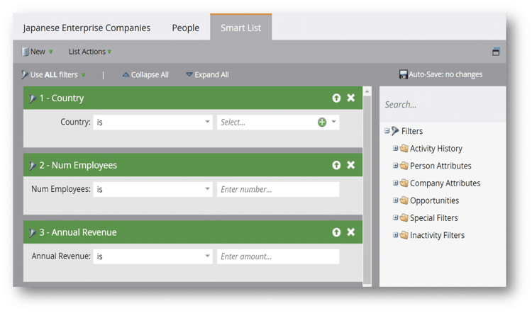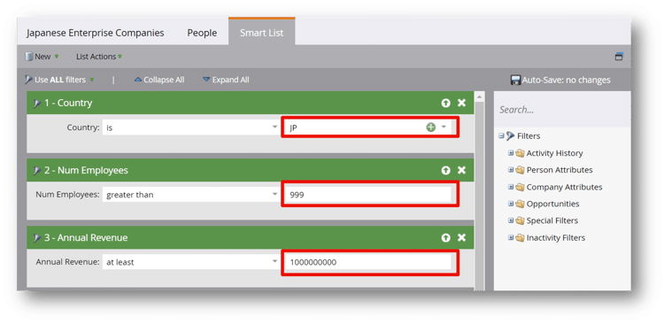 This smart list targets people who are in large Japanese companies, so you will add three filters to the smart list: Country, Number of Employees, and Annual Revenue.