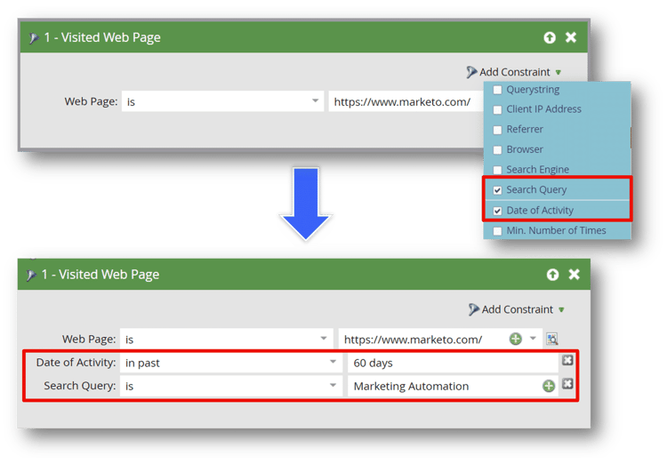 Apply any necessary constraints on your filters. This is not always necessary, but some filters allow you to be more precise in your criteria. For example, the Visited Web Page filter allows you to select from a list of constraints such as Search Query – which search term or terms led them to the page – or Date of Activity, to ensure that only newer activity is counted toward the results.