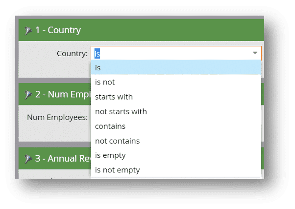 In this example, the Country filter operator is set to “is”, because you want to target a Japanese audience; the Num Employees filter’s operator is “greater than” to identify larger organizations, and the Annual Revenue filter’s operator is “at least” to ensure a minimum amount of revenue.