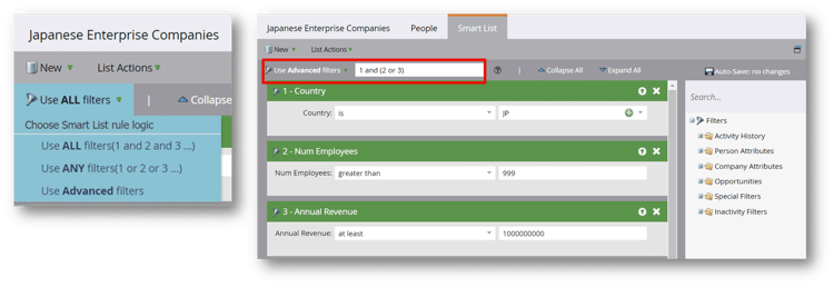 For the example Smart List, you want to include companies that have a Country value of Japan, AND either their number of employees is greater than 999 OR their company’s annual revenue is at least one billion yen, as shown here as 1 AND (2 OR 3).