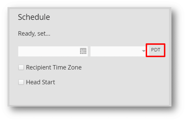 The schedule tile determines the date and time that your email will be sent. The time zone is the default time zone for your instance – you can change your time zone in Account Settings.