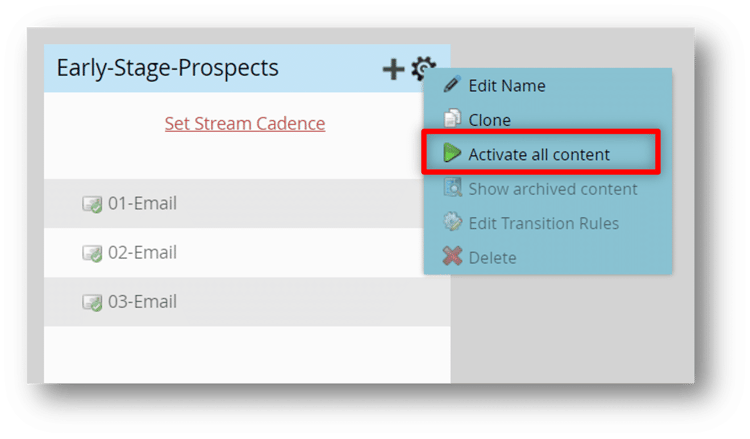 Learn to activate the content in the Early-Stage-Prospects stream by watching the expert activate each piece of content individually.