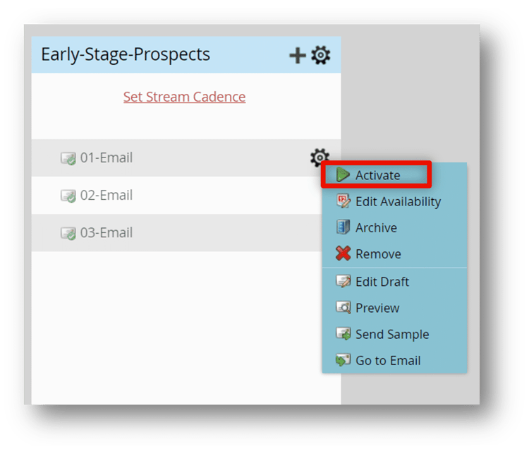Hover over the 02-Email asset in the Early-Stage-Prospects stream and click the gear icon.